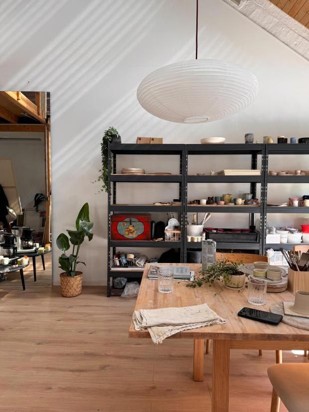 Das Atelier selbst besitzt zwei Drehscheiben, einen großen Arbeitstisch, eine Bandbreite an Werkzeugen, zahlreiche Farben und einem Brennofen.